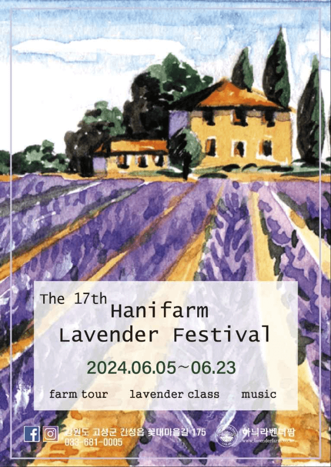 강원도 고성 금강산 자락의 작은 산골마을에서 진행하는 라벤더 축제입니다.매 6월이면 보랏빛 라벤더로 언덕은 물들고 라벤더 꽃 향기 가득하니 눈도 즐겁고 코도 즐거워진답니다. 뿐만아니라 라벤더와 양귀비, 호밀밭 등이 주변과 어우러지고, 유럽풍의 빈티지한 농장과 향기가게가 이국적인 장관을 만들어 완변한 힐링을 만들어줍니다.